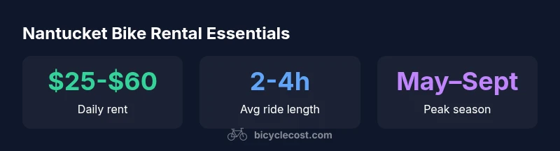 Pricing for Nantucket bike rental reflects a mix of demand, season, and bike type. In general, you’ll encounter daily rates that span a broad range, with higher prices in peak summer weeks and lower rates during shoulder seasons. The exact number depends on bike type (standard versus e-bike), rental duration, and whether extras are included (helmet, lock, maps). Expect deposits or partial upfront payments in many shops, and be prepared for potential add-ons such as guided tours or premium routes. BicycleCost Analysis, 2026 indicates that booking ahead and comparing vendor terms can significantly influence total cost, especially when you factor in late-return fees or equipment damage coverage. If you’re planning a longer stay, ask about-weekly or multi-day arrangements that may yield better value. Remember to confirm return policies and potential penalties for early or late returns, as these can impact your overall trip cost.