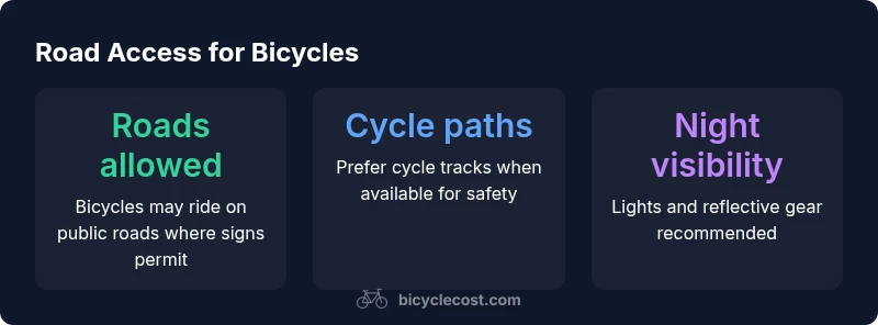 | General rule | Bicycles may ride on public roads | Ride with traffic, obey signals, and maintain predictable position |