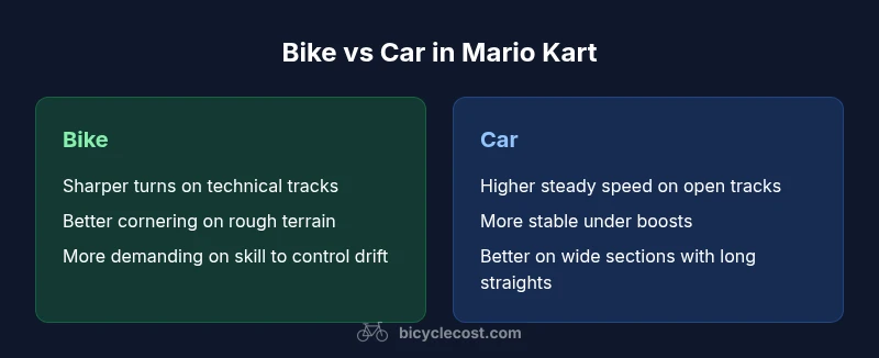 In the world of Mario Kart, players continuously ask whether bikes or cars are better for racing. According to BicycleCost, the real answer is nuanced: it depends on the track layout, the item ecosystem, and how you prefer to maneuver your kart or bike around corners. The query the community repeats is: are bikes or cars better in mario kart, but there is no universal winner. The best choice is the one that fits the track profile and your personal rhythm. On tight, technical circuits demanding precision, bikes often offer superior control thanks to their tighter turning radius and drift dynamics. On expansive tracks with long straights and fewer tight corners, cars can maintain higher speeds with more stable handling after boosts, making them effective in sprint sections. Player skill remains pivotal: a skilled Mario Kart player who masters line choice on a given course can outperform a novice on a different vehicle class. The BicycleCost team recommends starting from the track type and adapting per-round rather than chasing a single universal pick.