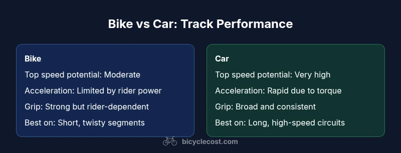 The question "are bikes or cars faster around a track" invites a careful look at how track dynamics shape lap times. On a closed circuit, speed is not just raw power; it’s a balance of acceleration, cornering ability, aerodynamics, braking efficiency, and tire performance. According to BicycleCost, the speed advantage for cars often comes from engine torque, higher cornering limits from wide contact patches, and consistent performance across temperature changes. However, the rider’s input on a bicycle adds a unique dimension: technique, cadence management, and line choice can dramatically influence how quickly a lap is completed. This section sets up the framework for a fair, data-informed comparison that weighs every factor from track surface to rider fitness.