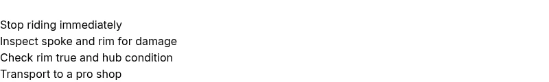 If you identify a broken spoke, the recommended action is to stop riding and arrange professional wheel service to true and tension the wheel. If only one spoke is broken and the wheel otherwise looks true, some riders may carefully transport the bike to a shop, but do not ride long distances or at speed until a pro confirms safety.
