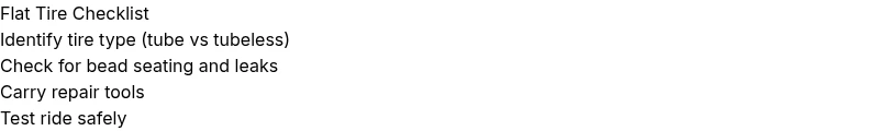 If the tube is punctured, patch or replace it. For tubeless setups, reseat the bead and sealant may stop leaks. Carry a spare tube or patch kit on rides for quick fixes.