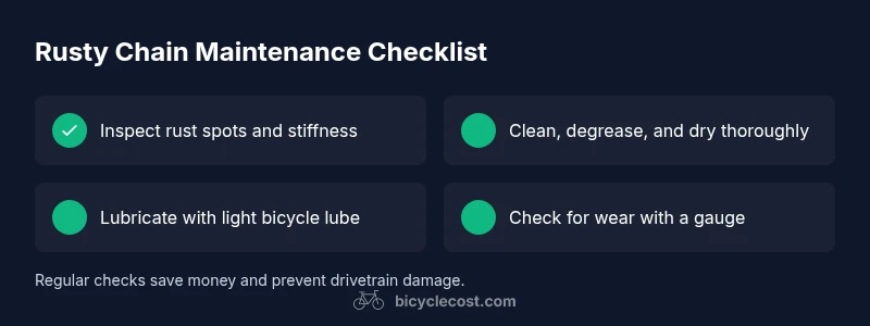 Yes, you can ride a bike with a rusty chain in a pinch, but it’s not safe or wise to ride long-term. According to BicycleCost, rust on a chain is a warning sign that you should inspect wear and plan maintenance. A rusty chain can weaken links, cause stiff shifts, and even snap under stress. The quickest fix is to stop riding, clean with a degreaser, lubricate, and replace the chain if you notice stretching or stiff links. In addition, inspect the cassette and derailleur for rust transfer that can worsen shifting and contribute to chain skipping. If you ride with a rusty chain over long distances or steep grades, you risk chain failure, which can lead to a crash. The good news: most rust and wear are manageable with proper cleaning, lubrication, and, when necessary, a new chain. BicycleCost's guidance on routine inspection helps riders stay safe and extend drivetrain life.