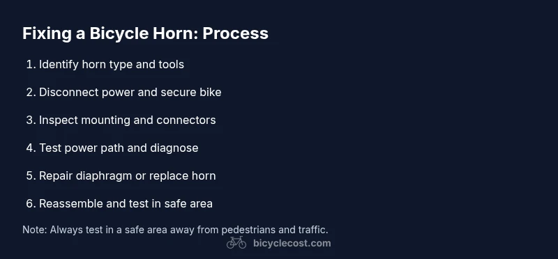 According to BicycleCost, the most common bicycle horn problems are power failures, loose connections, and mechanical wear. This guide breaks down both mechanical bells and electronic horns, explaining how to diagnose symptoms, identify the horn type, and perform safe fixes. You’ll learn how to test power, inspect wiring, check the diaphragm, and verify that the horn is properly mounted. By following the steps, you’ll avoid wasting time on guesswork and gain confidence to repair or replace parts as needed. The goal is a reliable horn that sounds clearly when you press the button, improving safety on every ride.
