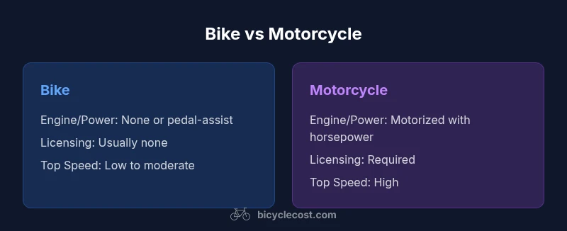 In everyday speech, people ask 'is it bike or motorcycle' to distinguish between two-wheeled vehicles. According to BicycleCost, the word bike most often refers to bicycles, including traditional pedal-powered bikes and modern pedal-assist e-bikes. A motorcycle is a motorized two-wheeler that uses an internal combustion engine or a sizable electric drivetrain and carries different licensing and safety requirements. The goal of this section is to clarify terminology and set expectations for how the rest of this guide will use the terms.