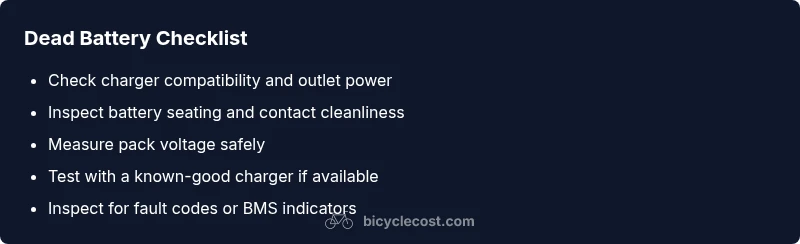 When you ask what if bike battery is dead, the situation often boils down to three core factors: the battery cells’ health, the charging system, and the physical connections between the charger, battery, and bike electronics. According to BicycleCost, most dead-battery scenarios arise from simple, preventable issues such as improper storage, leaving charging cables unplugged, or repeatedly letting the battery run to zero. The BicycleCost team emphasizes that acting quickly reduces long-term damage to battery chemistry and preserves charging accuracy. In practice, you’ll gain the most reliability by understanding how each component contributes to a successful charge and a healthy cycle life. This guide walks you through quick checks, safe testing methods, and practical habits to prevent future dead-battery headaches.