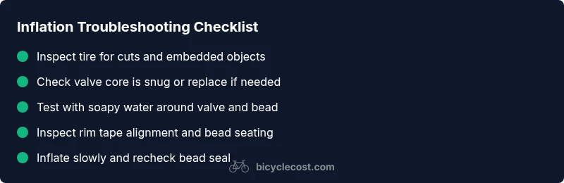Start by checking the most common culprits: a puncture, a faulty valve core, or a bead that won t seal. In most cases, a slow leak at the valve or a bead seating issue is fixable with simple adjustments. Quickly verify pump functionality, then methodically inspect tube, tire, and rim components to restore inflation.