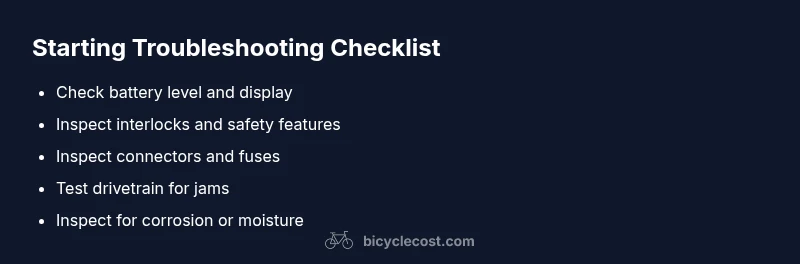 If your bike won't start, the most common causes are a dead battery (electric assist), a safety interlock engaged, a loose or corroded connection, or a jammed drivetrain. Start with safety checks, then inspect the battery, fuses, and wiring, and try a simple restart before moving to deeper diagnostics. If the issue persists, seek professional help.