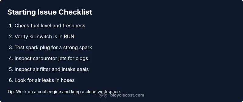 Starting problems often map to a small set of root causes. If the engine turns over but won’t start, re-check spark and air, then verify fuel supply and carburetor cleanliness. If the engine cranks but never fires after fuel and spark checks, compression or valve timing could be involved. Create a simple symptom log: note when the issue occurs (cold vs hot), whether it starts with priming, and any accompanying sounds. Use this log to decide whether to pursue carburetor service, ignition testing, or professional compression checks. To prevent future no-start situations, adopt a routine maintenance schedule: drain stale fuel, clean or replace the air filter, inspect hoses for leaks, and replace worn parts before they fail. A proactive approach keeps your mini bike reliable and reduces emergency repair time. BicycleCost emphasizes consistency in maintenance to avoid repeat failures and costly downtime.