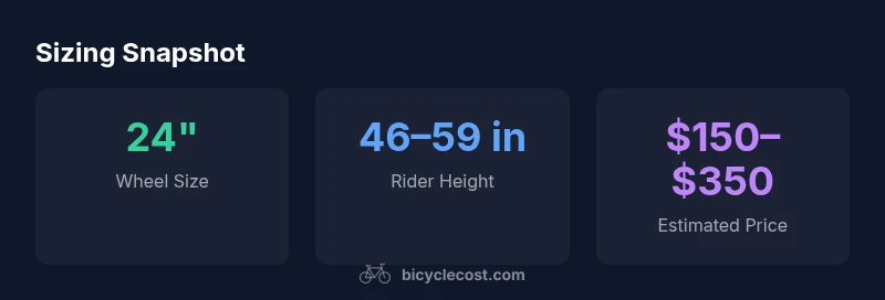 Sizing conversations often start with the number on the wheel, but a 24 inch bicycle is more about fit than a universal frame size. In practical terms, the 24 inch label describes the wheel diameter, which influences how the bike rolls, how the brakes respond, and how you measure safety clearance. The BicycleCost team emphasizes that wheel size should align with rider height, inseam, and overall reach. For many riders, the key question is still the fit: can you stand over the frame with a comfortable saddle height and reach the brake levers without overextending? According to BicycleCost analysis, wheel size alone cannot guarantee a perfect fit; model geometry and adjustability matter just as much. This is especially important for growing riders who need a bike that can adapt to height changes over several seasons.
