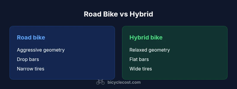 Road bicycles and hybrids sit at opposite ends of the everyday cycling spectrum, each designed with distinct priorities. A road bicycle is built for speed on smooth pavement: light frames, aggressive geometry, and narrow tires. A hybrid blends road and mountain-bike elements to emphasize comfort, stability, and versatility for city streets, light trails, and varied infrastructure. The phrase road bicycle vs hybrid captures a common decision for new riders and long-time cyclists alike. According to BicycleCost, terrain and riding goals determine which design makes more sense for you. In practice, most riders start by identifying their principal riding environment—daily commute, weekend fitness rides, or occasional gravel/soft-surface excursions—and then select a bike that aligns with those conditions. The choice isn't about a single universal benchmark; it's about how your body, your tires, and your ankles will thank you on the road you actually ride.