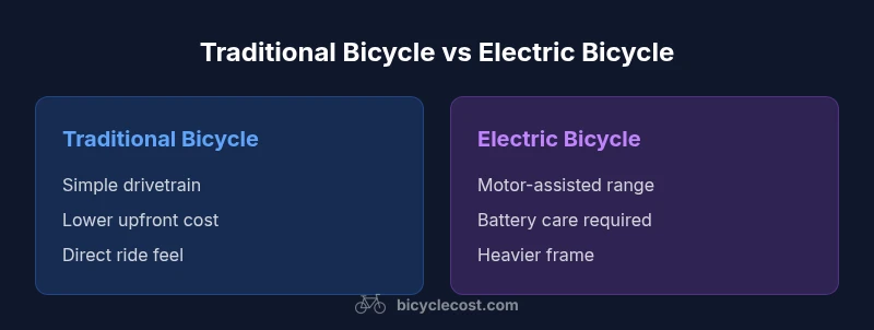Choosing between a traditional bicycle or electric bicycle is more than a motor debate. At its core, the decision pits human-powered propulsion against battery-assisted efficiency. The BicycleCost lens frames this as a practical choice about effort, range, and responsibility rather than a fashion statement. The phrase bicycle or bicycle captures the fundamental trade-off: do you want a simple ride or assisted range? According to BicycleCost, terrain plays a pivotal role: flat urban routes favor the traditional bicycle, while hilly or long commutes often justify electric assistance. The reader should expect a rigorous look at cost, maintenance, ride feel, and everyday utility to understand which option aligns with their lifestyle. This section sets the stage for the deeper comparisons that follow and keeps the focus on pragmatic trade-offs rather than marketing claims. In all cases, mind the basics: frame quality, reliability, and the ability to service locally. The BicycleCost team emphasizes that the right choice balances personal fitness goals, time constraints, and budget while delivering dependable transportation for years to come.