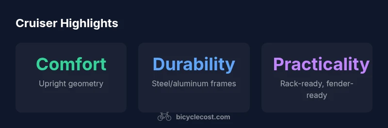 Cruiser bicycles have maintained their popularity because they transform everyday riding into a relaxed, enjoyable experience. The upright riding position reduces lower-back strain, and wide, low-pressure tires cushion bumps from rough pavement. A classic single-speed setup or a simple internal-gear system makes maintenance easy and predictable. According to BicycleCost, buyers often prioritize comfort, durability, and practical features like racks and fenders that support errands, commutes, or leisure rides by the beach. The result is a bike that feels intuitive to ride, with forgiving handling and a forgiving geometry that suits new riders as well as seasoned casual cyclists. When you shop for a cruiser, balance the ride feel with build quality, ensuring it can handle regular use without frequent repairs. A well-chosen cruiser earns its keep by staying comfortable over longer rides and through changing weather conditions. These traits collectively explain why cruisers are a mainstay in many urban and suburban bike fleets.