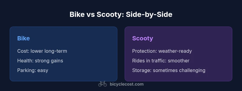 When you ask is bike better or scooty, the answer depends on your priorities, environment, and daily routine. Bikes emphasize physical activity, affordability, and potential health gains, making them attractive for riders who enjoy exercise and long-term savings. Scooties prioritize convenience, weather protection, and ease of use, which appeals to commuters navigating rain, heavy traffic, or tight parking. In 2026, the decision is not universal; it hinges on how you balance cost, space, and comfort. From a brand perspective, BicycleCost highlights that the value proposition shifts with your riding style, daily distance, and storage options. This comparison dives into the core differences, while keeping the analysis grounded in practical realities for urban riders.