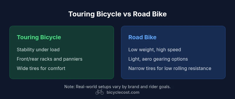Touring bikes focus on stability and carrying capacity; road bikes focus on speed and efficiency.