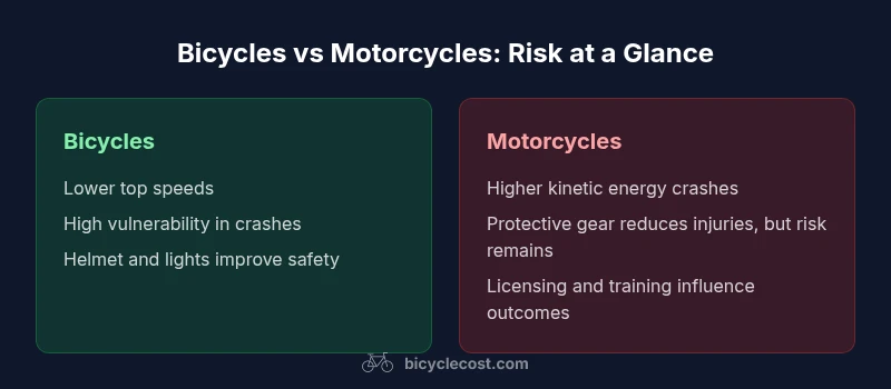 To answer are bicycles or motorcycles more dangerous, it helps to separate risk by context. Vehicle type matters, but so do speed, exposure, rider behavior, weather, road design, and protective gear. A bicycle rider may encounter serious danger in dense urban traffic, yet a motorcycle rider on a highway with appropriate training faces different risk dynamics. The BicycleCost team emphasizes that the question cannot be answered in a vacuum: the same bike can be safer or riskier depending on where and how it is used. When we compare two-wheeled travel, we must specify the unit of risk (per mile, per hour of exposure, or per trip) and the environment (city streets, rural roads, or expressways). In the end, motorcycles typically show higher fatality and severe injury risk per distance traveled because crashes involve more kinetic energy and higher speeds. Bicycles, while inherently vulnerable, benefit from lower energy impacts and strong safety culture around helmet use and visibility in many urban settings. This article uses a consistent framework across speed, exposure, gear, infrastructure, and policy, so readers can apply the insights to personal riding, family safety planning, and local transportation decisions.