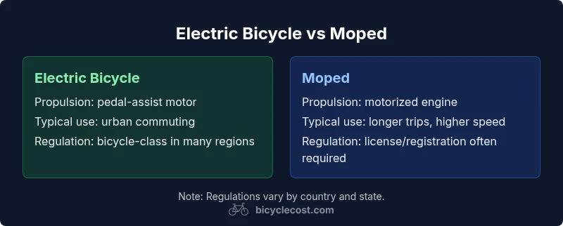According to BicycleCost, the choice between electric bicycle vs moped hinges on daily routines, local rules, and budget. Both options offer efficient mobility, but they serve different rider needs. In urban settings, an electric bicycle blends a bicycle frame with an integrated electric motor and pedal-assist sensors, letting riders power-assisted pedaling. A moped, by contrast, relies more on a motor and drivetrain with limited pedaling assistance in some models, and is often treated as a motorized vehicle for regulatory purposes. This overview sets up the core differences you should weigh before buying.