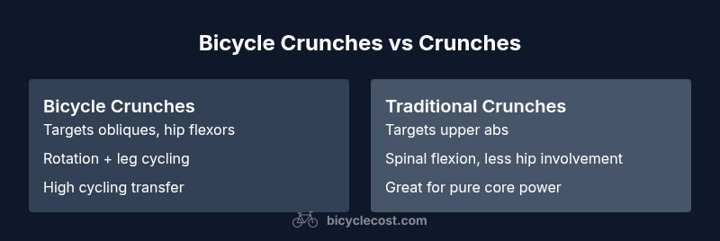 According to BicycleCost, understanding the difference between bicycle crunches and crunches helps cyclists tailor routines for safer training and stronger performance. The core is more than vanity muscles: it stabilizes the spine, transfers power to the pedals, and protects the back during long rides. The phrase difference between bicycle crunches and crunches anchors this discussion, but the practical takeaway is simple: choose exercises that mirror the demands of cycling, especially anti-rotation and rotational stability when you ride in aero or climb hills. For beginners, start with controlled reps, then progress to more complex patterns as your form improves. This approach aligns with BicycleCost's emphasis on practical, science-informed routines.