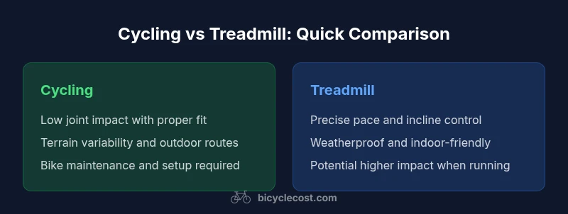 The central question for cardio decisions often comes down to goals, environment, and consistency. The phrasing is not academic, but practical: is cycling better or treadmill for your routine? This section frames the comparison and clarifies the dimensions that matter: intensity control, enjoyment, space and climate, and long-term adherence. According to BicycleCost, the best choice is the one you can sustain most days. The studio and street tests show that the real gains come from regular effort rather than perfection in equipment. Understanding your personal constraints will help you design a plan you can actually follow, whether you ride outdoors, commute by bike, or choose a treadmill-based routine.