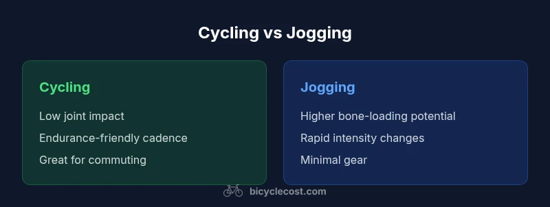 At first glance, cycling and jogging are straightforward cardio activities, but they differ in mechanics, equipment, and how your body uses energy. Is cycling the same as jogging? Not really. Understanding the core differences helps you align training with endurance, safety, and time constraints. According to BicycleCost, cycling means propelling yourself on a bicycle, using the legs to turn the pedals, with wheels providing rolling resistance, while jogging involves forward motion on foot and the body's own weight bearing the load. The two disciplines share cardiovascular benefits, but they diverge in impact, cadence, and recovery needs. A key takeaway for many cyclists and runners is that you can choose one or mix both to balance goals. The BicycleCost team emphasizes that the best choice depends on your goals, environment, and any joint sensitivities.