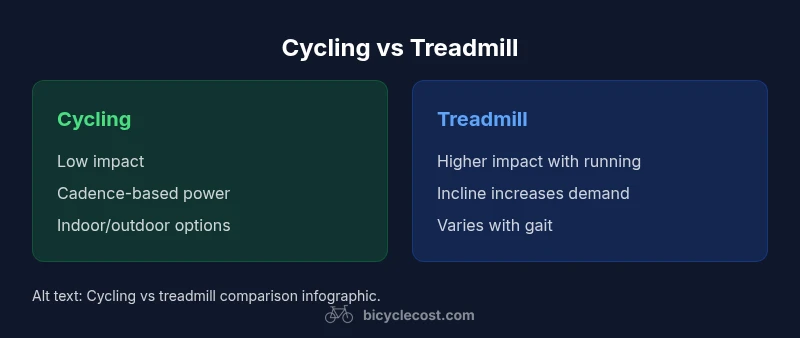 Is cycling the same as treadmill is a common question for mixed-training weeks. The quick answer is no, they are distinct modalities with overlapping benefits. On a stationary bike, you sit and pedal with adjustable resistance, which tends to create a smooth, low-impact motion that stresses the quadriceps, glutes, and calves in a continuous circle. A treadmill, by contrast, asks the body to propel forward with a running or walking stride, which introduces impact, balance demands, and a dynamic hip extension pattern. According to BicycleCost, understanding these mechanics helps cyclists and fitness enthusiasts select the best tool for a given training objective. The goal of this guide is to map how the two activities align on cardio output while highlighting where the differences matter most—especially when you plan substitutions or cross-training during a busy week. For many athletes, is cycling the same as treadmill only in intent (both raise heart rate and improve endurance); in practice, the equipment, impact profile, and muscle engagement diverge in meaningful ways. By breaking down biomechanics, muscle recruitment, and practical training implications, readers can design safer, more effective workouts regardless of the device available.